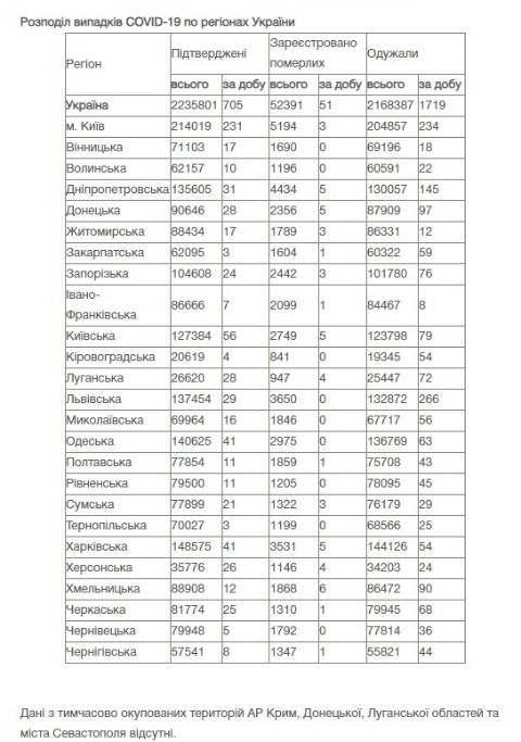 Натомість в Україні зареєстрували 2 235 801 випадок зараження коронавірусом, з них 52 391 людина померла, а 2 168 387 людей – одужали. За добу захворіли на коронавірус 705 осіб.