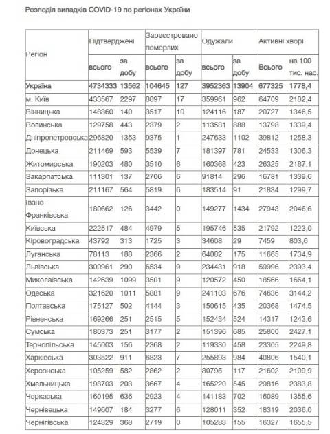 Натомість в Україні зареєстрували 4 734 333 випадки зараження коронавірусом, з них 104 645 людей померли, а 3 952 363 людей – одужали. За добу захворіли на коронавірус 13 562 осіб.