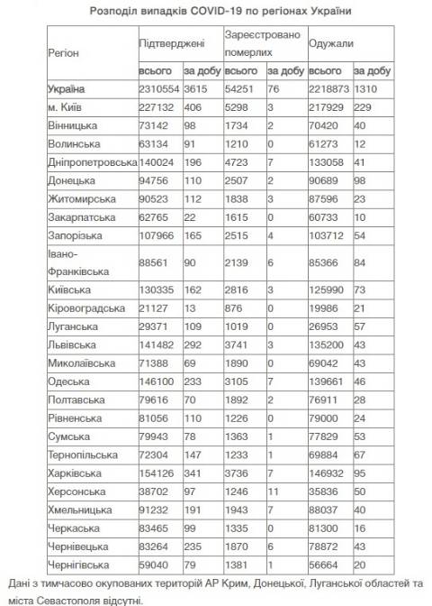 Натомість в Україні зареєстрували 2 310 554 випадки зараження коронавірусом, з них 54 251 людина померла, а 2 218 873 людей – одужали. За добу захворіли на коронавірус 3 615 осіб.