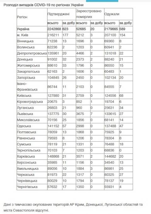 Cтаном на ранок у області зафіксували коронавірус у 137775 осіб, а в Україні інфікувалися 2242868 осіб.