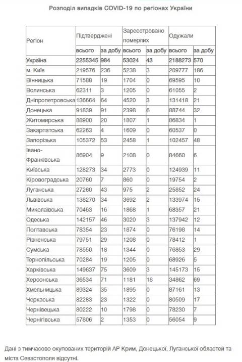 Натомість в Україні зареєстрували 2255345 випадків зараження коронавірусом, з них 53024 людей померли, а 2188273 людей – одужали. За добу захворіли на коронавірус 984 особи.