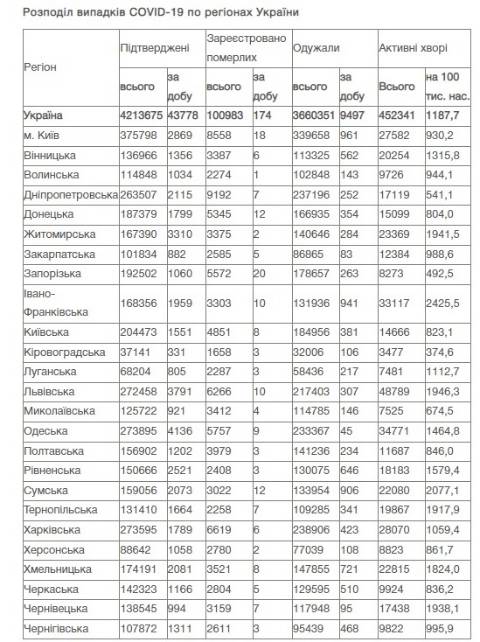Натомість в Україні зареєстрували 4213675 випадків зараження коронавірусом, з них 100983 людей померли, а 3660351 людина – одужала. За добу захворіли на коронавірус 43778 осіб.