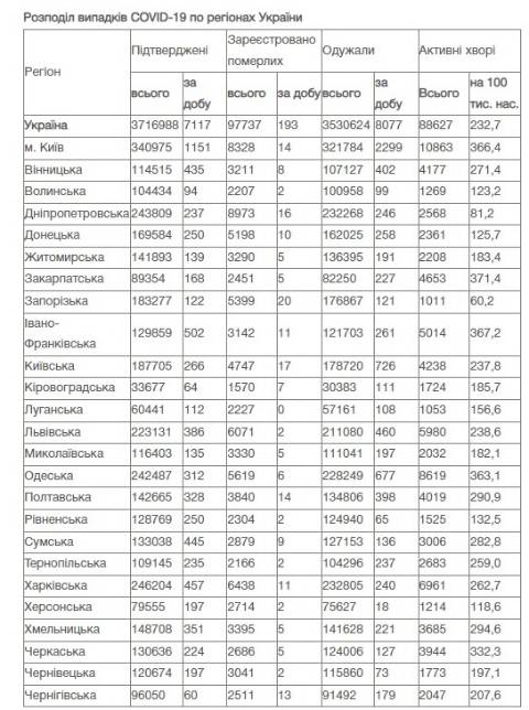 Натомість в Україні зареєстрували 3716988 випадків зараження коронавірусом, з них 97737 людей померли, а 3530624 людини – одужали. За добу захворіли на коронавірус 7117 осіб.