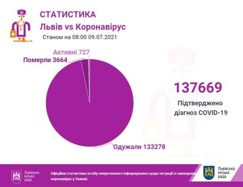 Станом на сьогодні у Львові та Львівщині підтвердили 137669 випадків інфікування коронавірусом (з них у Львові – 67017), з них 3664 випадки смертельні (з них у Львові – 1795), а 133278 пацієнтів одужали (у Львові – 64846).