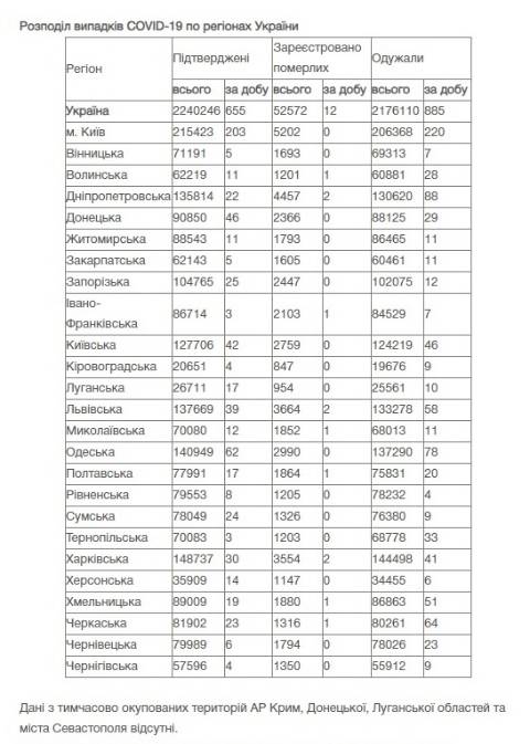 Натомість в Україні зареєстрували 2 240 246 випадків зараження коронавірусом, з них 52 572 людей померли, а 2 176 110 людей – одужали. За добу захворіли на коронавірус 655 осіб.