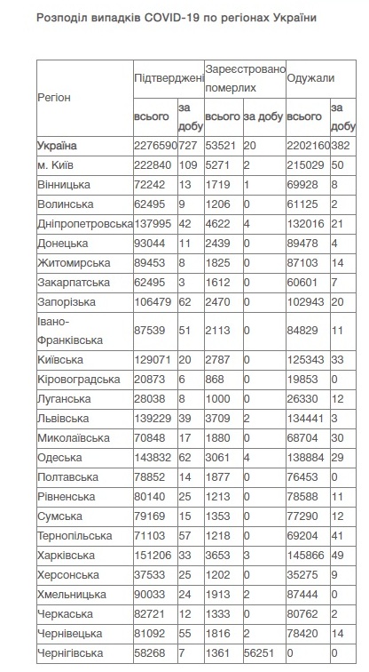 Натомість в Україні зареєстрували 2276590 випадків зараження коронавірусом, з них 53521 людина померла, а 2202160 людей – одужали. За добу захворіли на коронавірус 727 осіб.