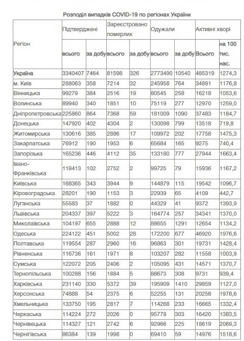 Натомість в Україні зареєстрували 3340407 випадків зараження коронавірусом, з них 81598 людей померли, а 2773490 людей – одужали. За добу захворіли на коронавірус 7 464 ооби.