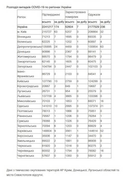 Cтаном на ранок у області зафіксували коронавірус у 137709 осіб, а в Україні інфікувалися 2 241 217 осіб.