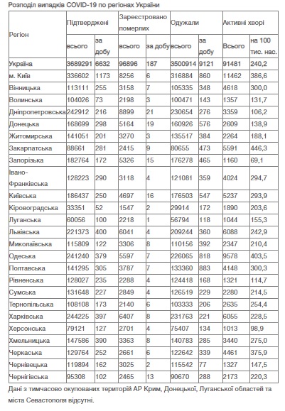 Натомість в Україні зареєстрували 3 689 291 випадок зараження коронавірусом, з них 96 896 людей померли, а 3 500 914 людини – одужали. За добу захворіли на коронавірус 6 632 особи.