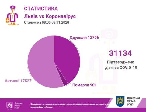 Станом на 08.00 год у Львові та Львівщині підтвердили 31134 випадки інфікування коронавірусом, з них 901 випадок смертельний, а 12706 пацієнтів одужали.