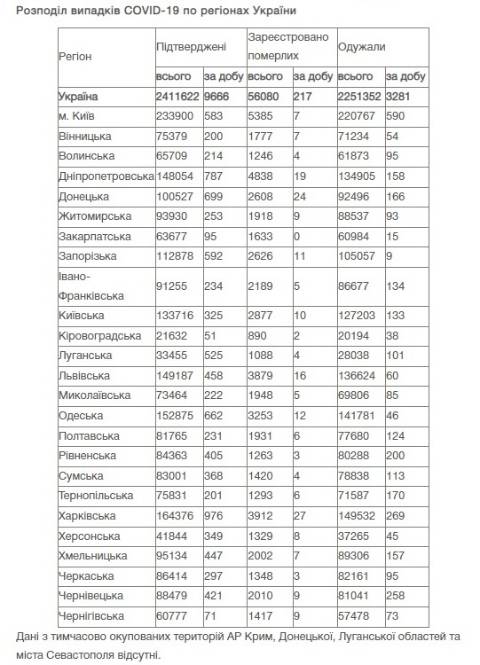 Натомість в Україні зареєстрували 2411622 випадки зараження коронавірусом, з них 56080 людей померли, а 2251352 людей – одужали. За добу захворіли на коронавірус 9666 осіб.