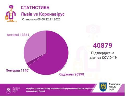 Станом на 08.00 год у Львові та Львівщині підтвердили 40879 випадків інфікування коронавірусом, з них 1140 випадків смертельні, а 26398 пацієнтів одужали.