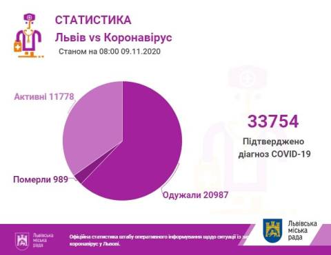 Станом на 08.00 год у Львові та Львівщині підтвердили 33754 випадки інфікування коронавірусом, з них 989 випадків смертельні, а 20987 пацієнтів одужали.