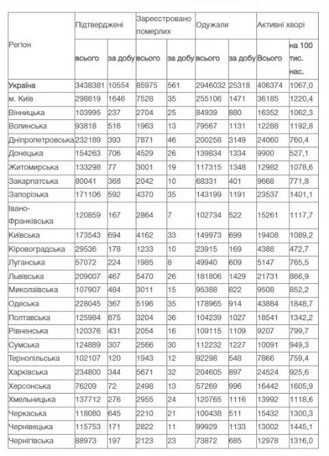 Натомість в Україні зареєстрували 3 438 381 випадок зараження коронавірусом, з них 85 975 людей померли, а 2 946 032 людини – одужали. За добу захворіли на коронавірус 10 554 особи.