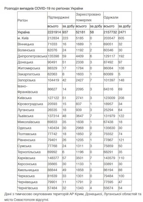 Натомість в Україні зареєстрували 2 231 914 випадків зараження коронавірусом, з них 52 181 людина померла, а 2 157 732 людей – одужали. За добу захворіли на коронавірус 937 осіб.