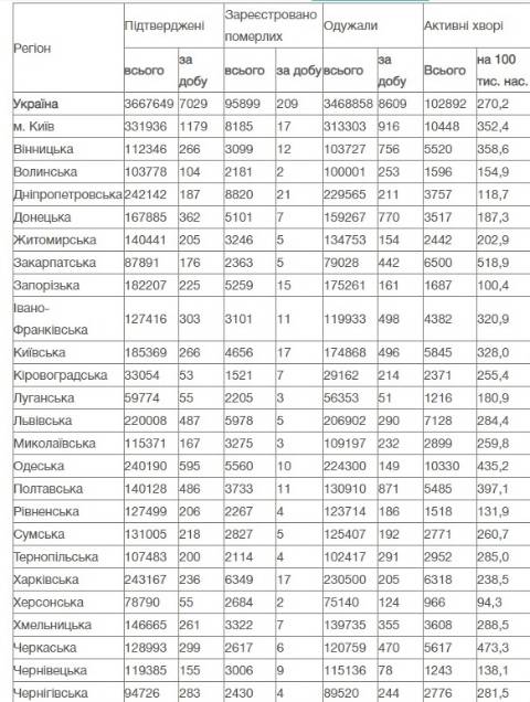 Натомість в Україні зареєстрували 3 667 649 випадків зараження коронавірусом, з них 95 899 людей померли, а 3 468 858 людей – одужали. За добу захворіли на коронавірус 7 029 осіб.