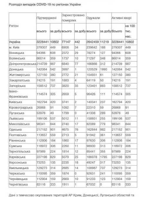Натомість в Україні зареєстрували 3228441 випадок зараження коронавірусом, з них 77147 людей померли, а 2642459 людей – одужали. За добу захворіли на коронавірус 10802 осіб.