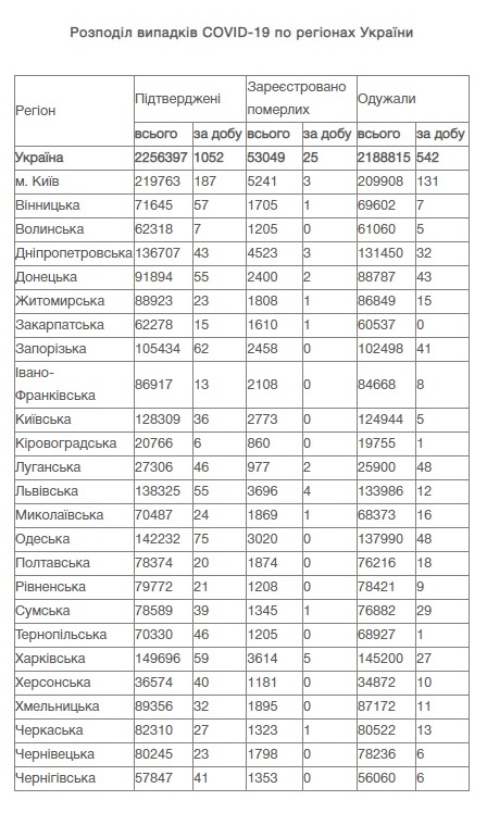 Натомість в Україні зареєстрували 2256397 випадків зараження коронавірусом, з них 53049 людей померли, а 2188815 людей – одужали. За добу захворіли на коронавірус 1052 особи.