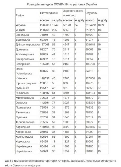 Натомість в Україні зареєстрували 2262601 випадок зараження коронавірусом, з них 53173 людей померли, а 2194791 людина – одужала. За добу захворіли на коронавірус 1247 осіб.
