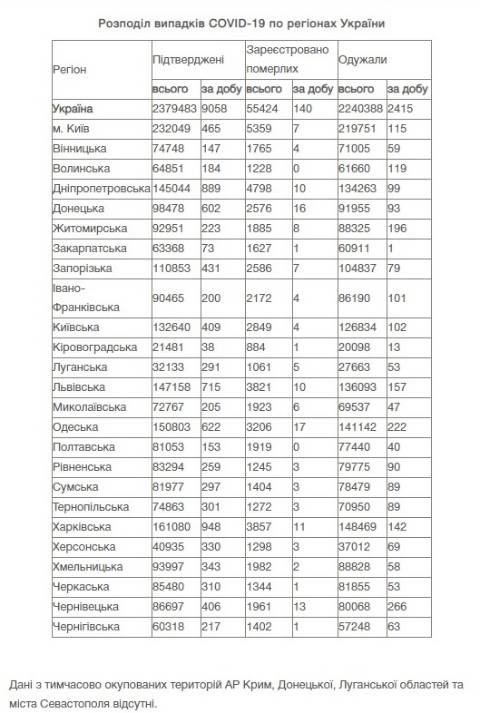 Натомість в Україні зареєстрували 2379483 випадки зараження коронавірусом, з них 55424 людини померли, а 2240388 людей – одужали. За добу захворіли на коронавірус 9058 осіб.