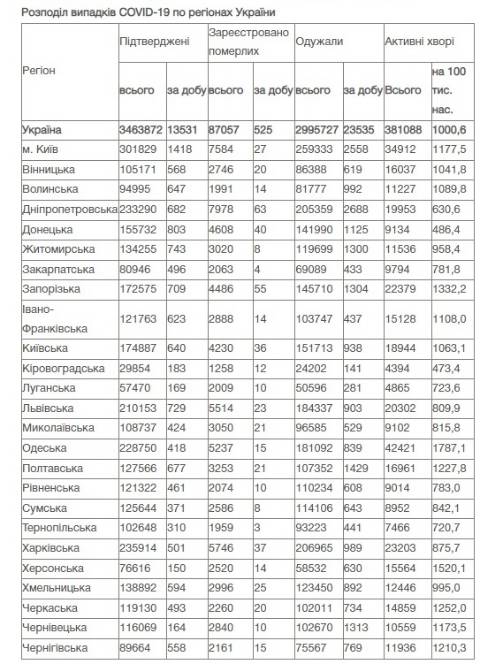 Натомість в Україні зареєстрували 3463872 випадки зараження коронавірусом, з них 87057 людей померли, а 2995727 людей – одужали. За добу захворіли на коронавірус 13531 особа.