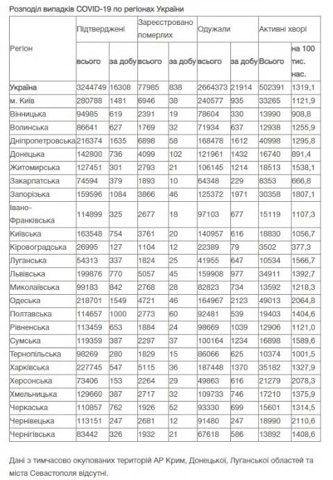 Натомість в Україні зареєстрували 3244749 випадків зараження коронавірусом, з них 77985 людей померли, а 2664373 людей – одужали. За добу захворіли на коронавірус 16308 осіб.