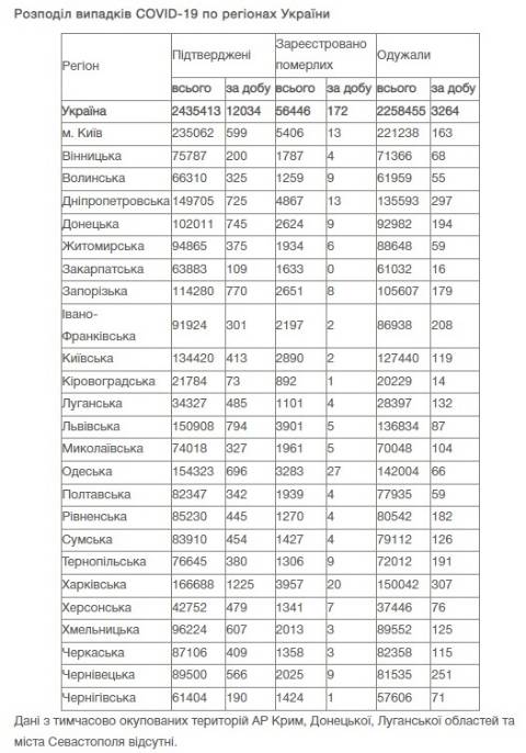 Натомість в Україні зареєстрували 2435413 випадків зараження коронавірусом, з них 56446 людей померли, а 2258455 людей – одужали. За добу захворіли на коронавірус 12034 осіб.