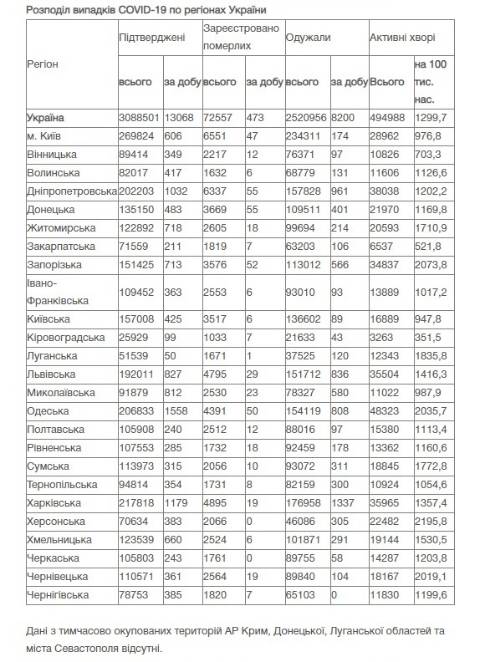 Натомість в Україні зареєстрували 3088501 випадок зараження коронавірусом, з них 72557 людей померли, а 2520956 людей – одужали. За добу захворіли на коронавірус 13068 осіб.