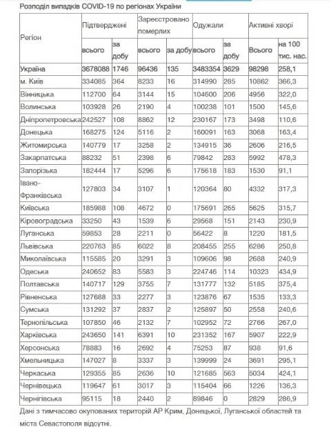 Натомість в Україні зареєстрували 3 678 088 випадків зараження коронавірусом, з них 96 436 людей померли, а 3 483 354 людини – одужали. За добу захворіли на коронавірус 1746 осіб.