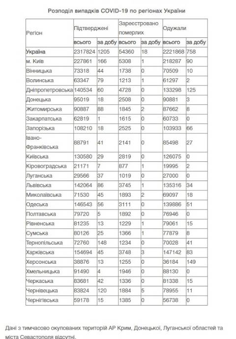 Натомість в Україні зареєстрували 2317824 випадки зараження коронавірусом, з них 54360 людей померли, а 2221868 людей – одужали. За добу захворіли на коронавірус 1205 осіб.