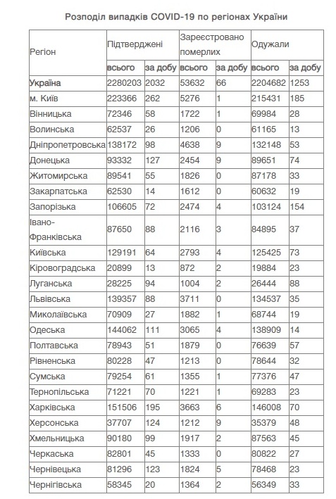 Натомість в Україні зареєстрували 2280203 випадки зараження коронавірусом, з них 53632 людей померли, а 2204682 людей – одужали. За добу захворіли на коронавірус 2032 особи.