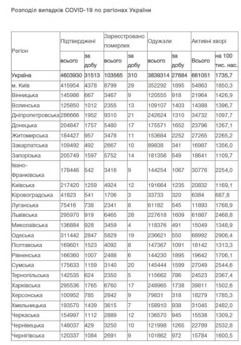 Натомість в Україні зареєстрували 4603930 випадків зараження коронавірусом, з них 103565 людей померли, а 3839314 людей – одужали. За добу захворіли на коронавірус 31 513 осіб.