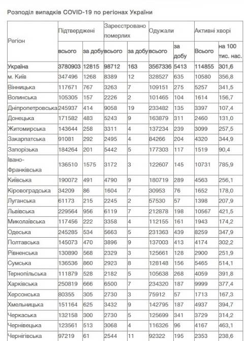 Натомість в Україні зареєстрували 3780903 випадки зараження коронавірусом, з них 98712 людей померли, а 3567336 людей – одужали. За добу захворіли на коронавірус 12815 осіб.