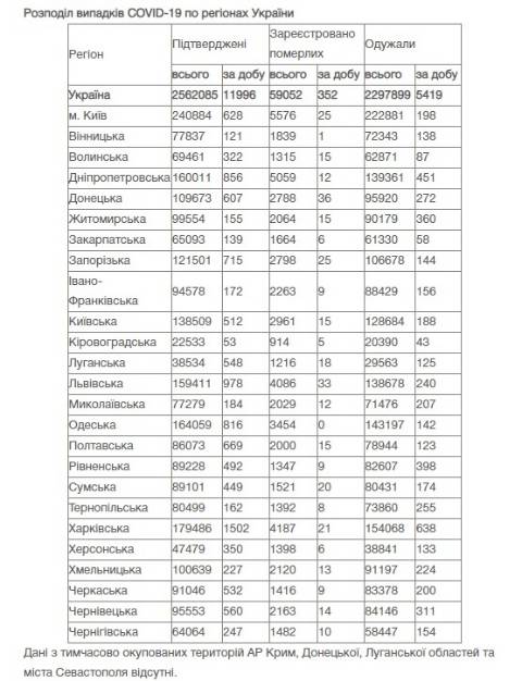 Натомість в Україні зареєстрували 2562085 випадків зараження коронавірусом, з них 59052 людини померли, а 2297899 людей – одужали. За добу захворіли на коронавірус 11996 осіб.