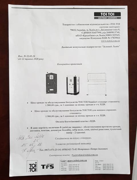 На нашому обладнанні великими літерами нанесено назву компанії  та номер телефону. Якщо людина бачить якусь проблему, вона може відразу нам про це повідомити. Ми фіксуємо кожен номер та кожну розмову. Ми перевірили всі дзвінки зі Львова за весь минулий рік і першу половину цього року. Жодної скарги зі Львова не було. Також ми не мали жодних скарг від ЛКП "Зелений Львів" чи на пошту чи телефоном. Ми можемо надати докази.  Все було ідеально. Слова Данилюка про скарги – це наклеп. Також безпідставними є його закиди, щодо того, що ТОІ ТОІ не сплачує місцеві податки. У мене є зареєстрована наша пропозиція з підписом і датою від ЛКП "Зелений Львів". Ми там пишемо, хто ми та за яких умов готові надавати послуги. Там вказано, що ми зареєстровані у Львові, і що вже 20 років сплачуємо місцеві податки в міський бюджет Львова.