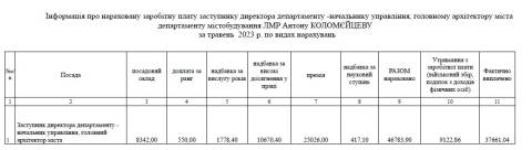 У травні цього року начальнику управління архітектури та урбаністики Львівської міської ради Антону Коломєйцеву нарахували 46 783,90 грн заробітної плати. Зокрема, у цю суму увійшли такі виплати: