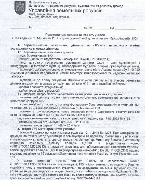 Згідно з документом, йдеться про ділянку площею 0,0886 га, що знаходиться на вул. Брюховицькій, 150 у Шевченківському районі Львова й перебуває у комунальній власності Львова. На цій ділянці є фундамент будівлі літньої кухні площею 31,1 м² та сарай площею 26,4 м², що перебувають у приватній власності Миляника, згідно зі свідоцтвом про право на спадщину від 17 червня цього року.