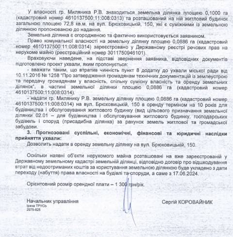 Як пояснили у міськраді, раніше Василю Милянику належала земельна ділянка площею 0,1 га вул. Брюховицькій, 150 де знаходиться житловий будинок, а ділянку площею 0,0886 га він орендував у міськради. Відтепер земля й житловий будинок перейшли у власність Руслана Миляника й він планує орендувати у міськради землю площею 0,0886 га на вул. Брюховицькій, 150.