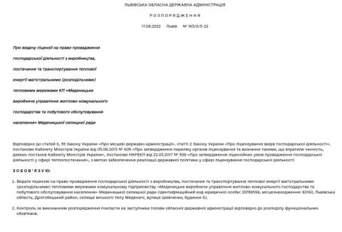 "З метою забезпечення реалізації державної політики у сфері ліцензування господарської діяльності зобов'язцю видати ліцензію на право провадження господарської діяльності з виробництва, постачання та транспортування теплової енергії магістральними (розподільчими) тепловими мережами КП "Меденицьке виробниче управління житлово-комунального господарства та побутового обслуговування населення" Меденицької селищної ради" – йдеться у розпорядженні.