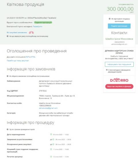 Департамент комунікацій та внутрішньої політики Львівської ОВА оголосив тендер у системі ProZorro на квіткову продукцію, яку переможець тендеру має постачати до 31 грудня 2023 року.