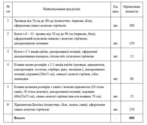 Згідно з закупівлею, впродовж цього року переможець торгів має поставити департаменту комунікацій всього 680 одиниць квітів. Зокрема, це 180 троянд, 130 букетів із троянд, 15 букетів з різних квітів, кошики з квітів різних розмірів та 250 хризантем, оформлених синьо-жовтою стрічкою.