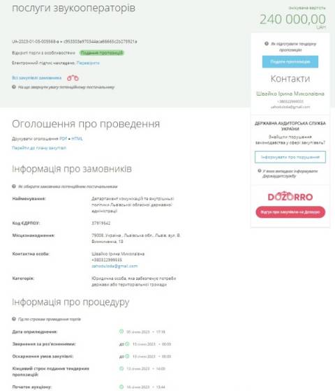 Департамент комунікацій та внутрішньої політики Львівської ОВА оголосив тендер у системі ProZorro на послуги звукооператорів, які переможець тендеру має постачати до 31 грудня 2023 року.