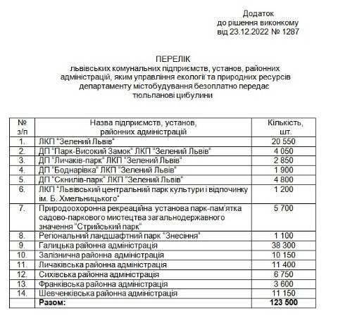 Личаківська РА отримала у грудні 2022 року 11400 цибулин нідерландських тюльпанів, які висадила на 11 локаціях: 3 – у Львові, 6 – у Винниках та по 1 – у селах Лисиничі та Підбірці.