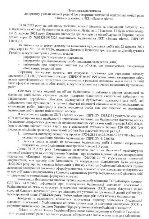 Зокрема, у квітні цього року з'ясувалось, що ЛКП "Зелене місто" дозволив проводити підряднику будівельні роботи на вул. Пластовій без всіх необхідних дозвільних документів та експертиз, які дозамовив й вніс в дозвіл на виконання робіт вже після того, як будівництво заводу тривало 1,5 року.