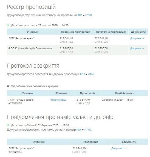 Аукціон стартував 21 лютого, участь у ньому взяли ЛКП "Ратуша-сервіс" та підприємець Назарій Кручок, які запропонували надати послуги за 212 544,40 грн і 212 600 грн відповідно. переможцем обрали комунальне підприємство, а вартість послуг становила 212 600 грн.