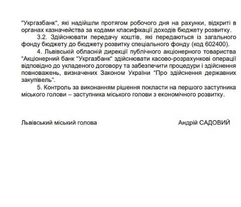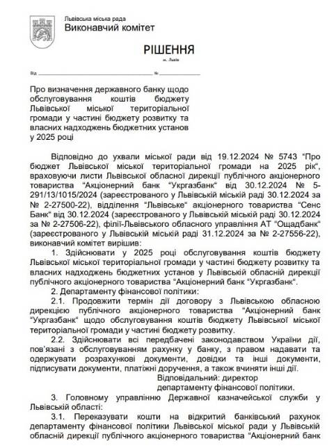 "Здійснювати у 2025 році обслуговування коштів бюджету Львівської міської територіальної громади у частині бюджету розвитку та власних надходжень бюджетних установ у Львівській обласній дирекції публічного акціонерного товариства "Акціонерний банк "Укргазбанк" – йдеться в документі.
