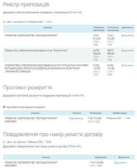 Аукціон стартував 13 березня, участь у ньоиму взяли ПП "Володар-Маркет" (7 541 513,69 грн), ТзОВ "Еталон-Ком" (8 613 806 грн), ТзОВ "Спеціальна науково-реставраційна проектно-будівельно-виробнича майстерня "Україна-Реставрація" (9 400 137,60 грн). Переможцем обрали ПП "Володар-Маркет", а очікувана вартість послуг становила 9 533 717 грн.