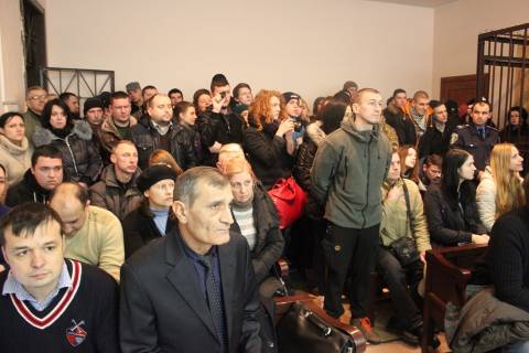 Незворушними є хіба конвоїри, які розідляють зал на зону учасників засідання (суддя, двоє адвокатів-жінок, прокурор, секретар) та решту (підсудні, активісти, журналісти, батьки, адвокат потерпілого, група підтримки).