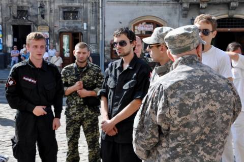 Згодом на підмогу матусям підходять браві парубки з Правого сектору підтримати правопорядок.