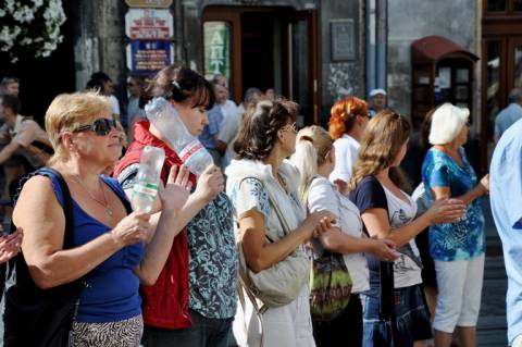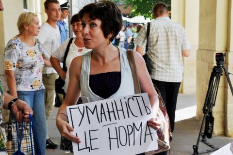 Захисників тварин зовсім небагато 15-20. На відміну від інших пакетувальних груп ці посміхаються, тихо-мирно стоять і роздають листівки.